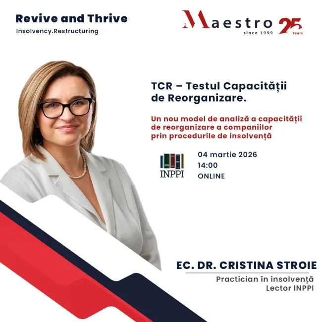 Maestro Lichidare susține excelența în practica insolvenței prin cercetare și metodologii inovatoare. Vă așteptăm să analizăm împreună viitorul reorganizărilor judiciare.